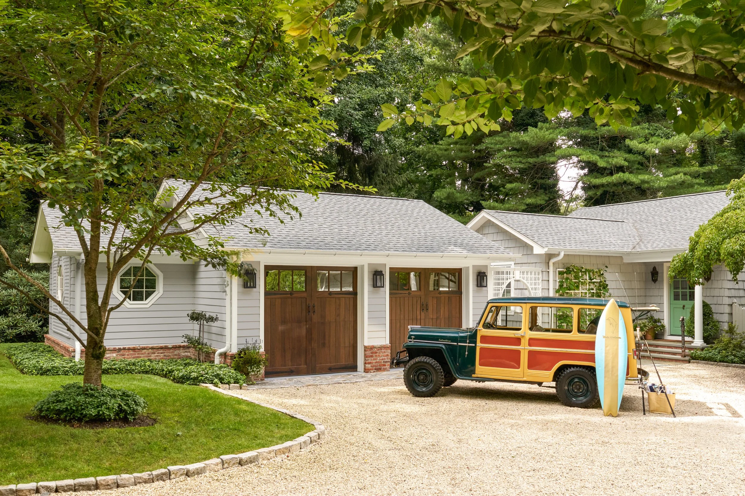 The garage’s aesthetic is complimentary to the architecture of the existing house. Clapboard, corner boards, and half round gutters adorn the walls above the brick water table. A simple asphalt shingle roof matches that of the existing home. Lanterns and plants layer the front wall of the garage. Planting beds anchor the garage to the lawn. A door on the rear provides access to the golf cart for short trips to the club.