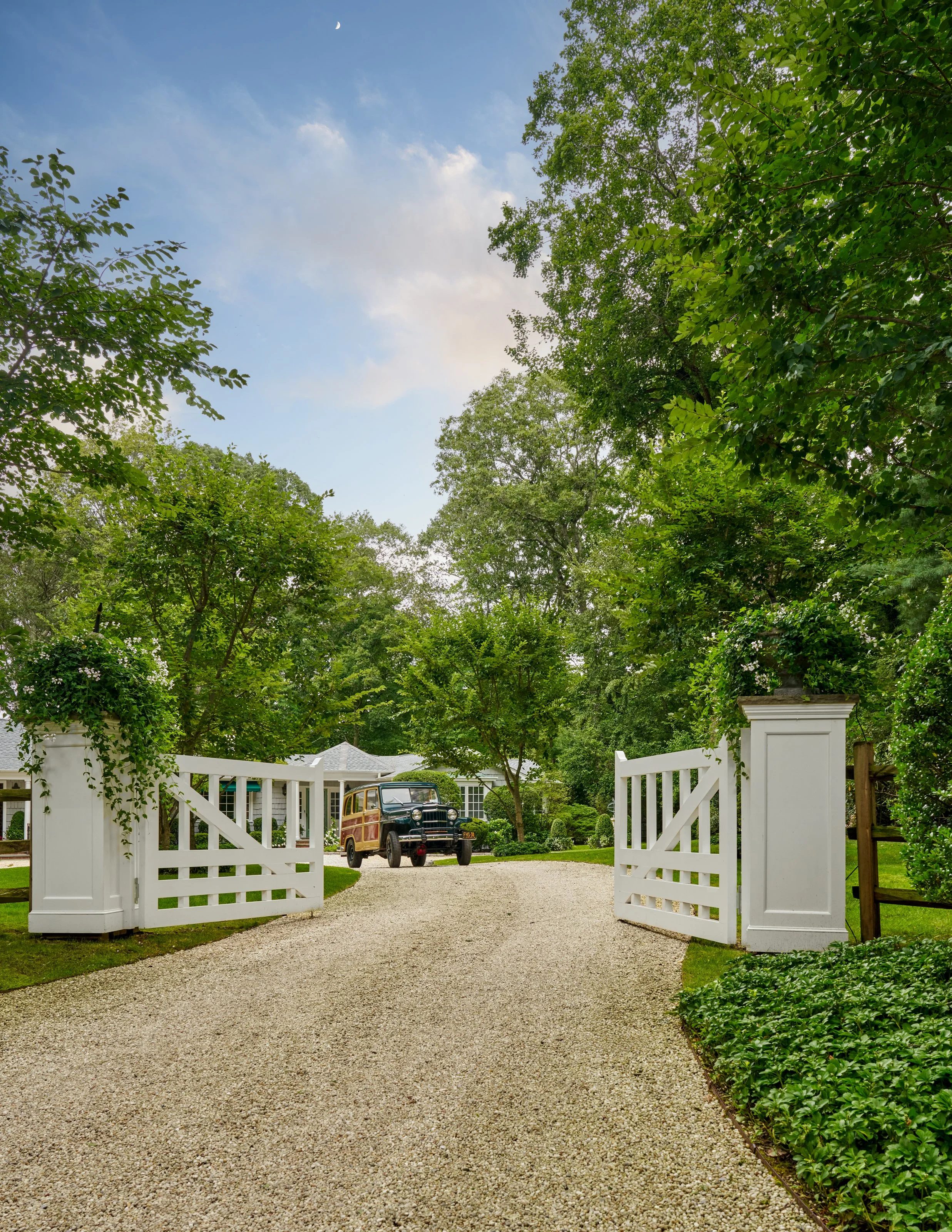 A stone driveway leads through a newly constructed pair of gates. The arrival court is
